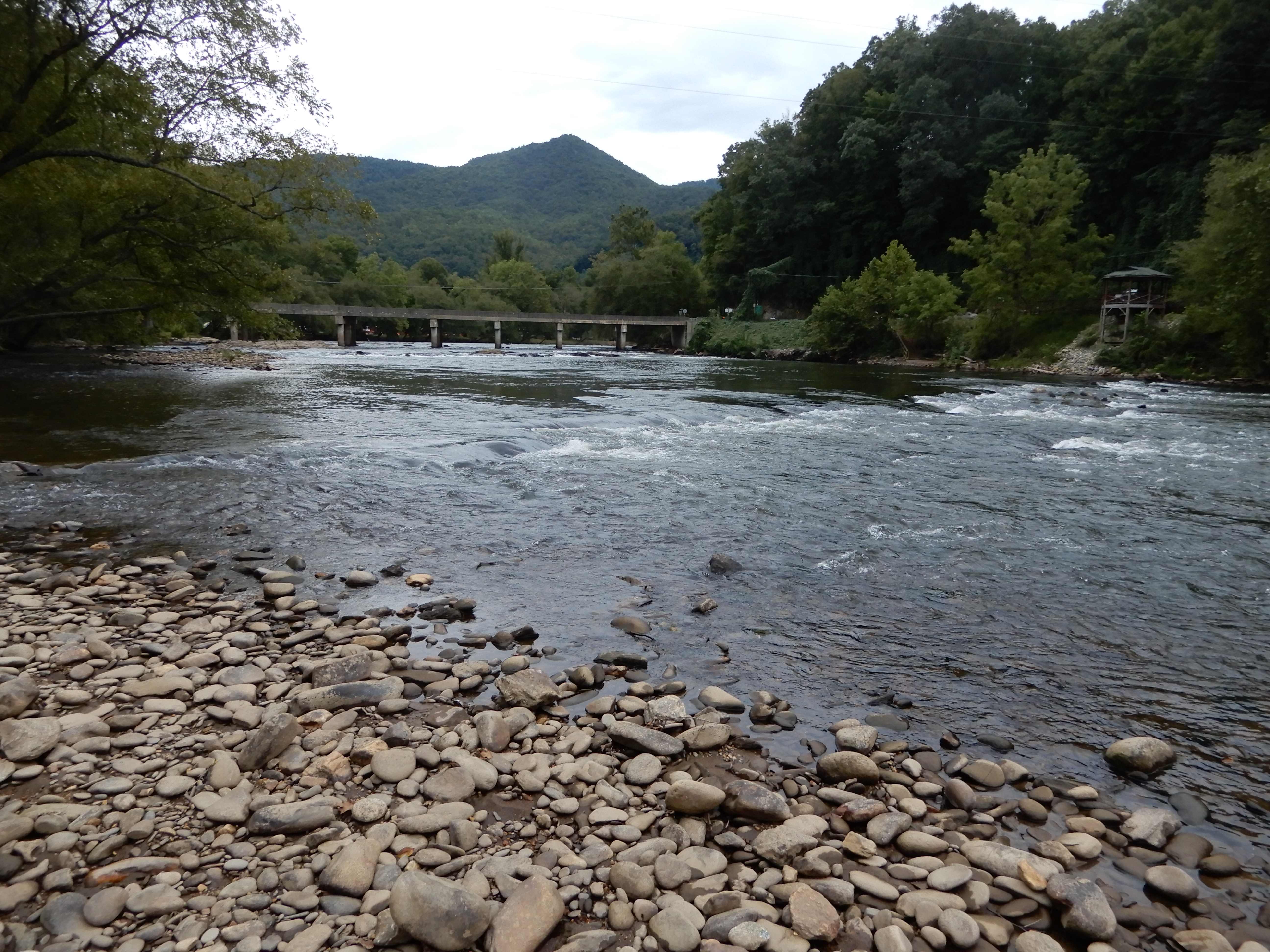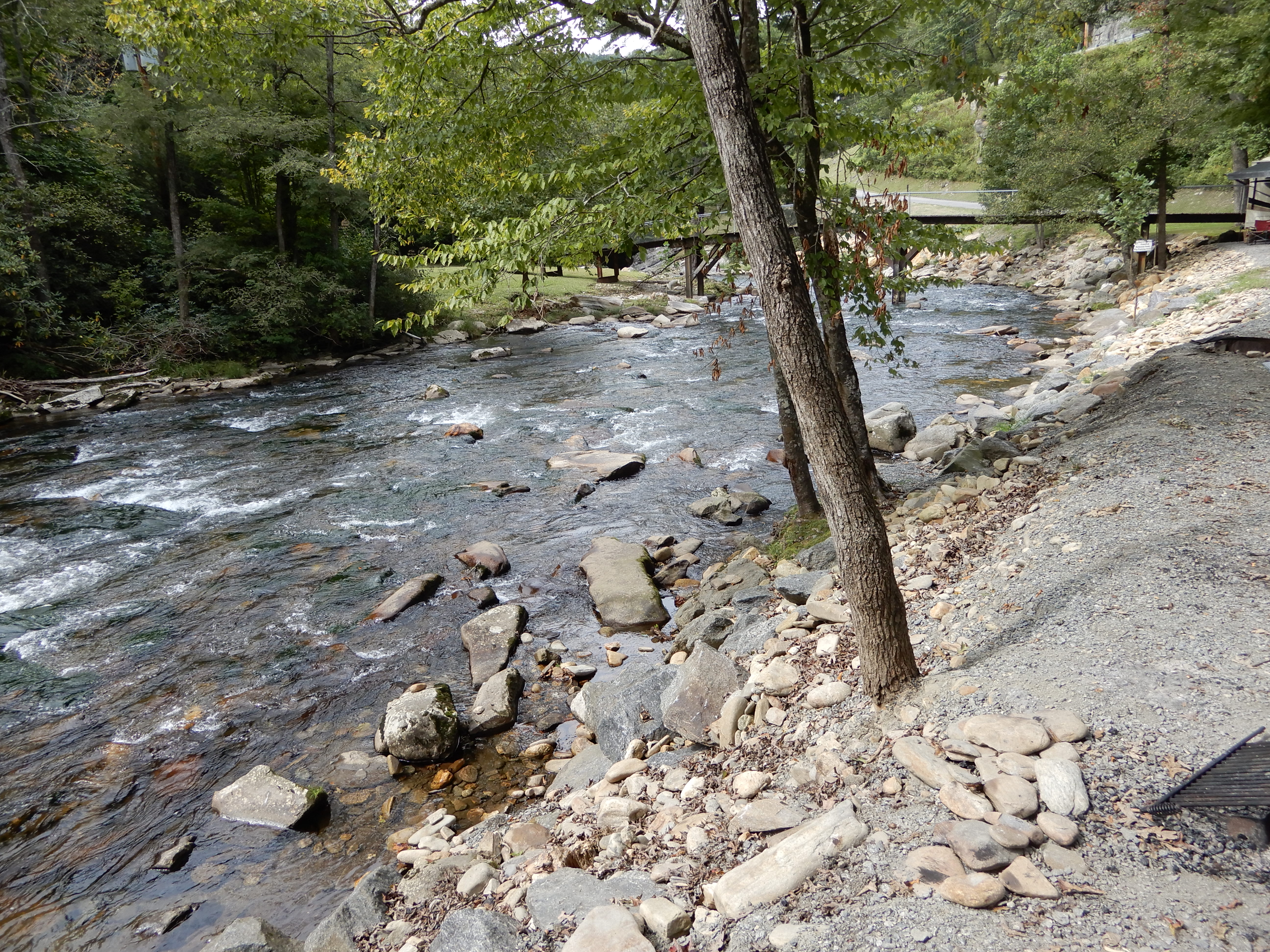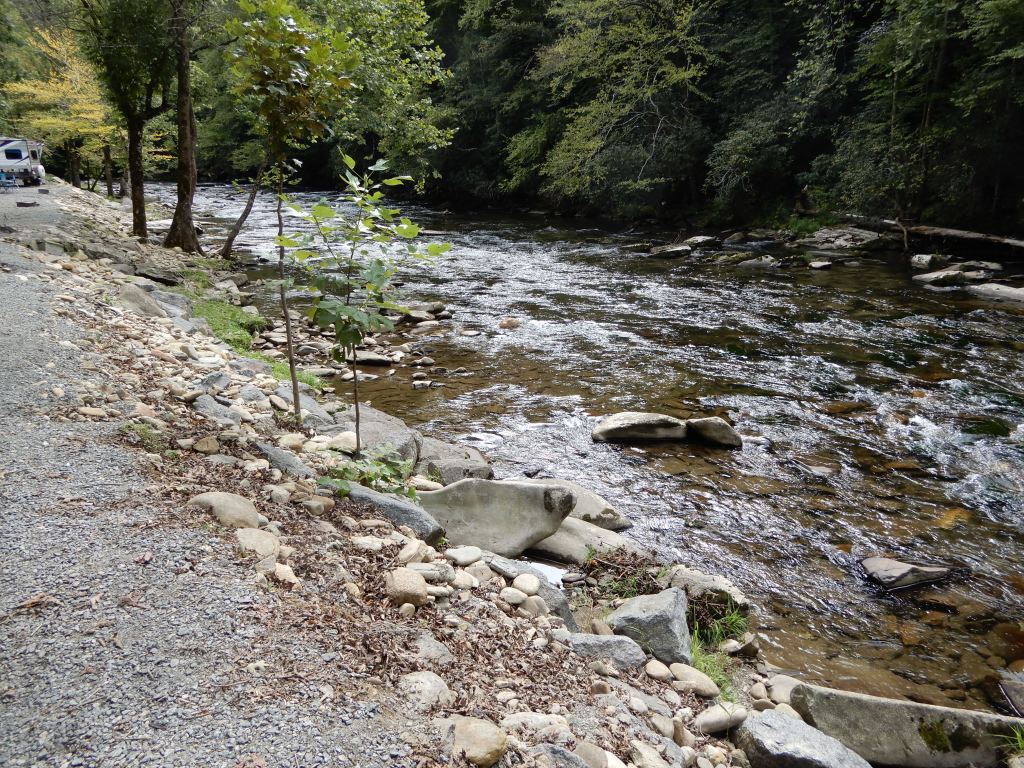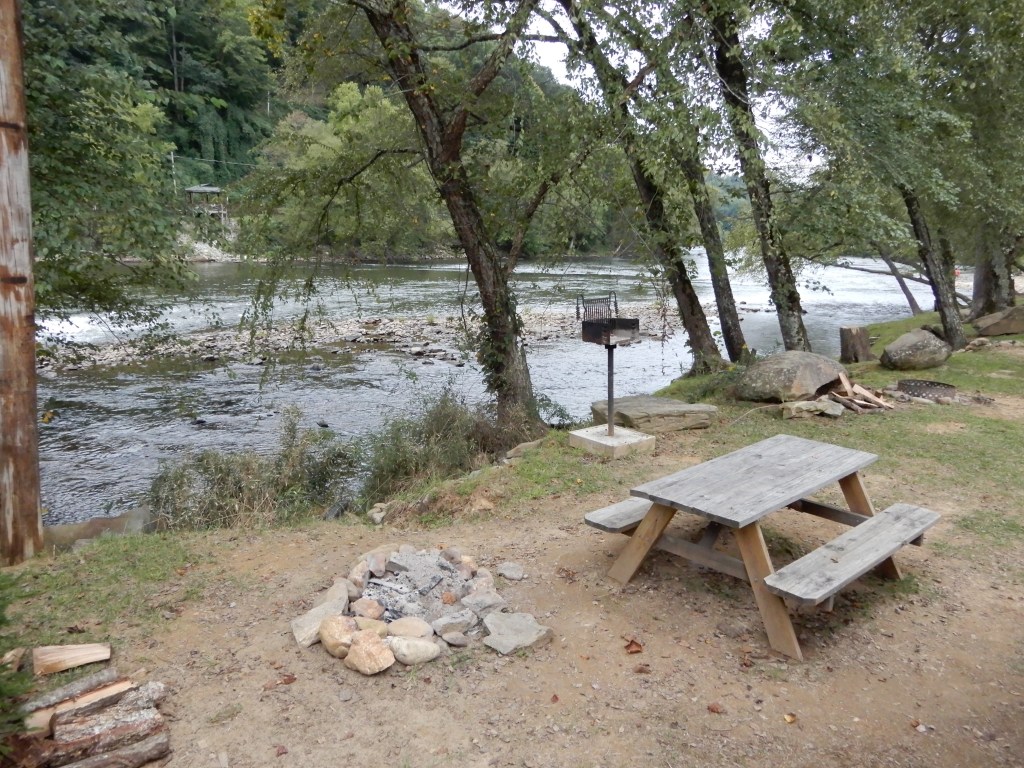 We drove out of the park into Cherokee. Outside of town we found a private campground, River Valley, and set up in a beautiful site alongside a roaring mountain river.