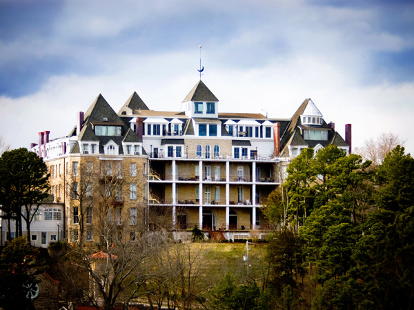 As he continues to back down the long driveway, his house and grounds come into view. The estate is sprawling and immense, set in a neighborhood of similar properties. He drives away, and several neighbors wave enthusiastically. He waves in acknowledgement, smiles (or it could be a grimace). Then glances down at the flier in the passenger seat. The banner reads ‘Eureka Springs Crescent Resort and Spa’, with a photo of a grand eighteenth century hotel, set high on a wooded hilltop.